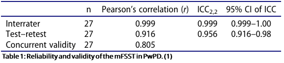 1,2Boddy A, Mitchell K, Ellison J, Brewer W, Perry LA. Reliability and validity of modified Four Square Step Test (mFSST) performance in individuals with Parkinson’s disease. Physiother Theory Pract. 2023;39(5):1038-1043. doi:10.1080/09593985.2022.2031360